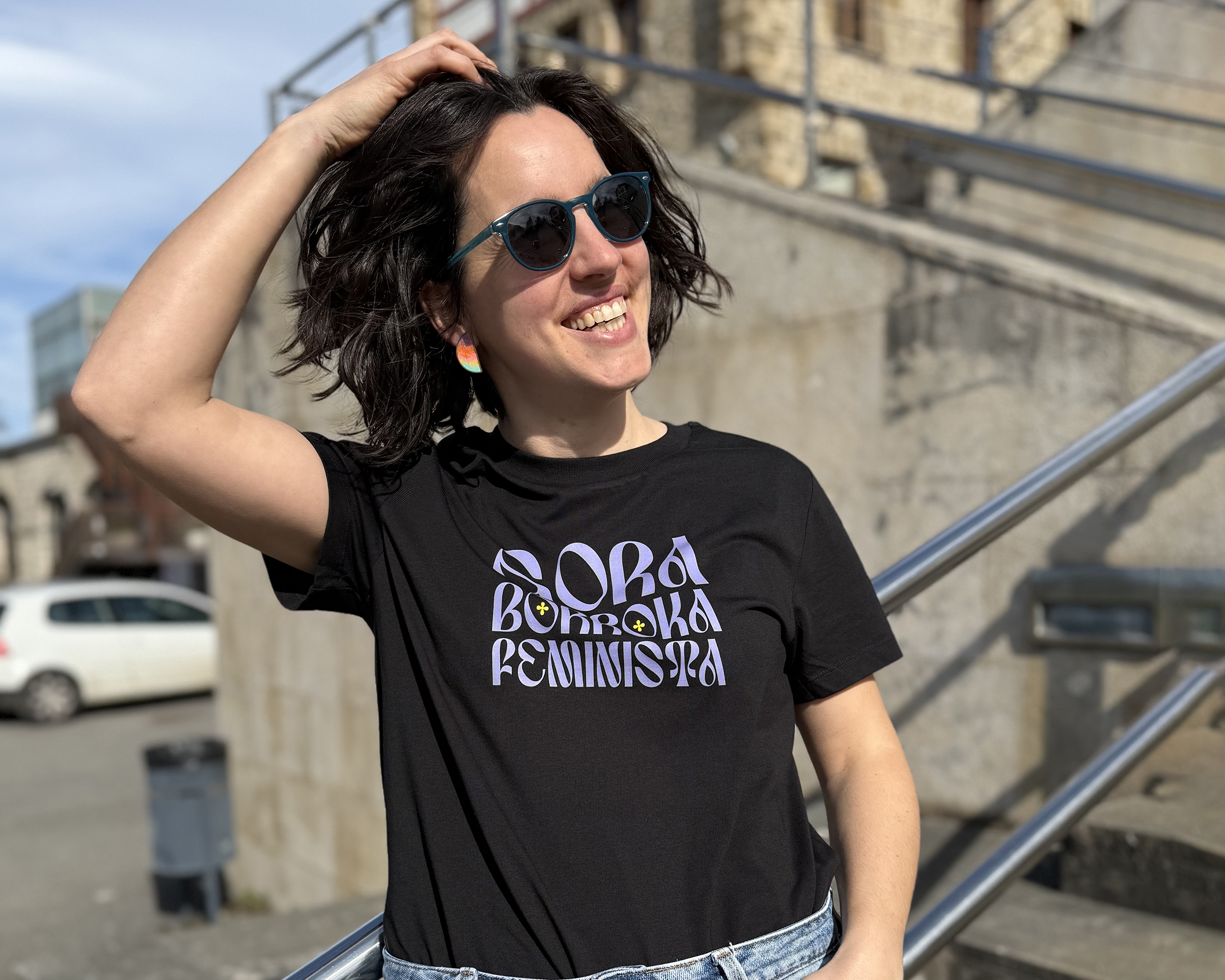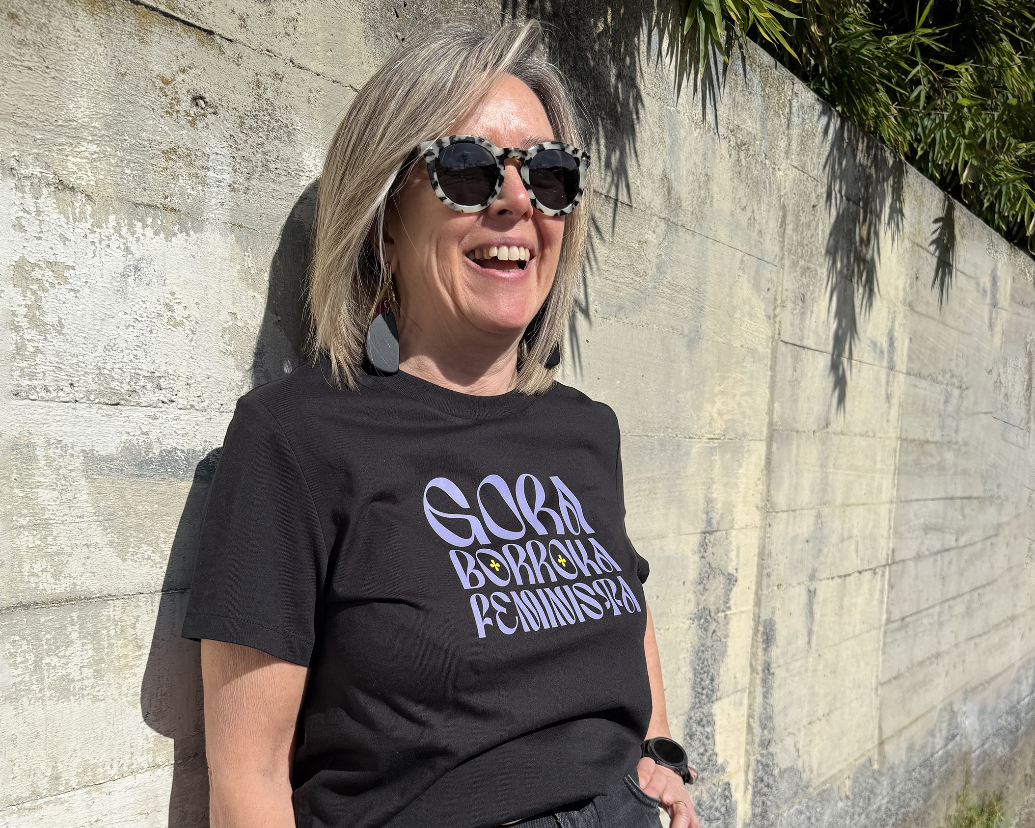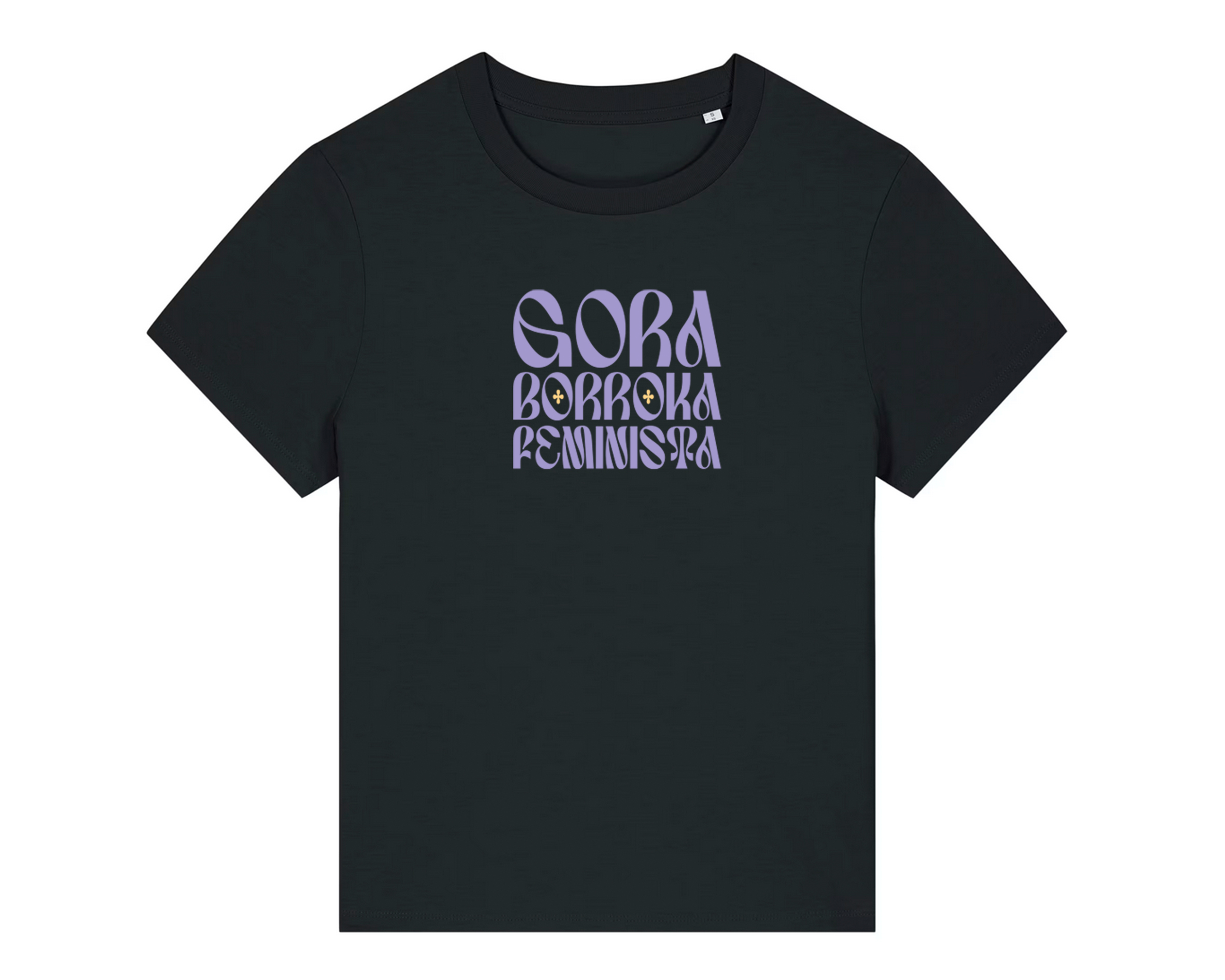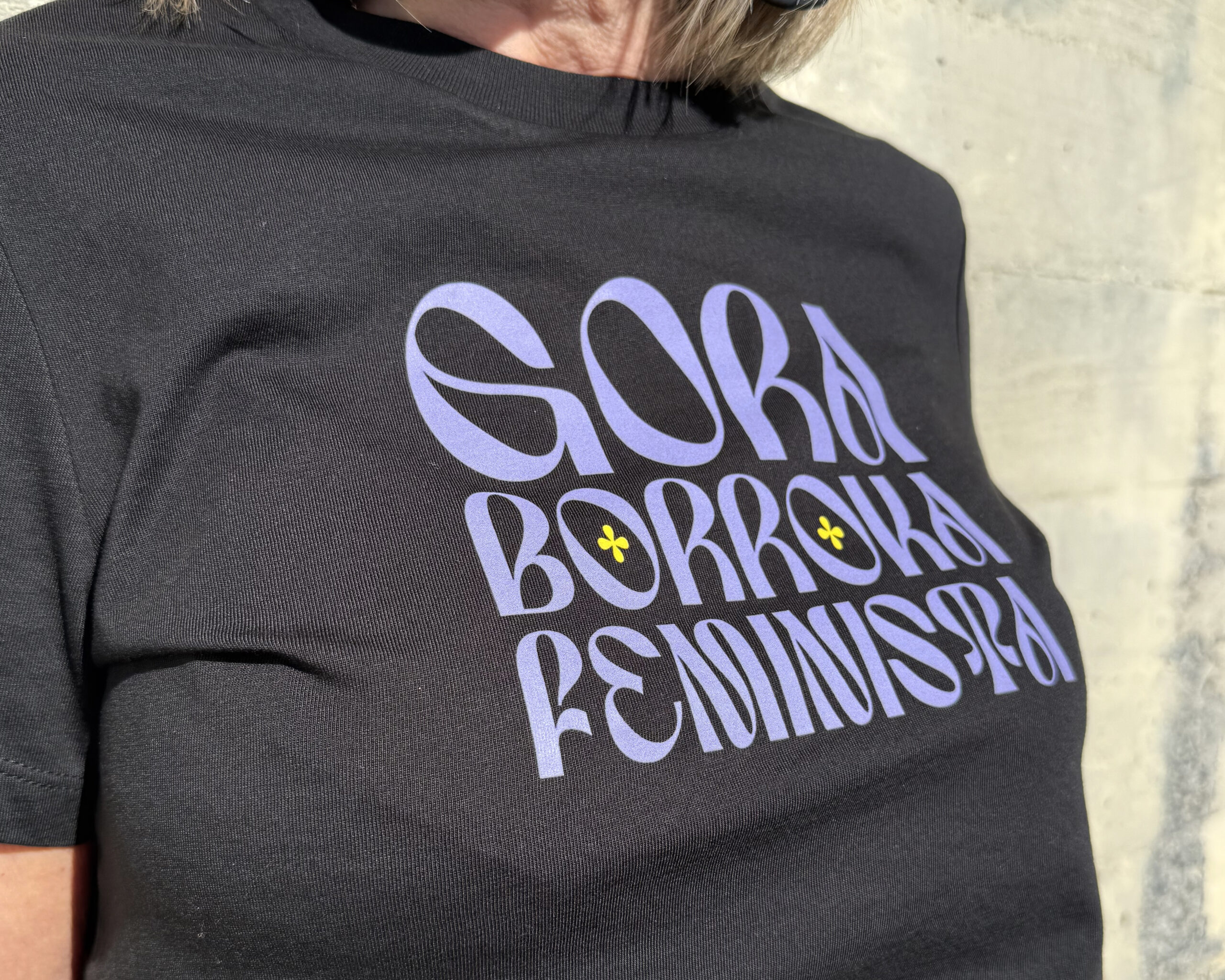 Kamiseta beltz honek aurrean “Gora Borroka Feminista” darama, letra morez idatzita — indarraren, batasunaren eta aldaketaren kolorea. Diseinu garbia baina mezuz betea: kalean, jaietan, egunerokoan… momentu oro borroka bizirik dagoela eta denon artean egin behar dugula dugula gogorarazteko.